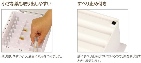 ・底面が丸く小さな薬も整理しやすく、取りやすい形状になっています。